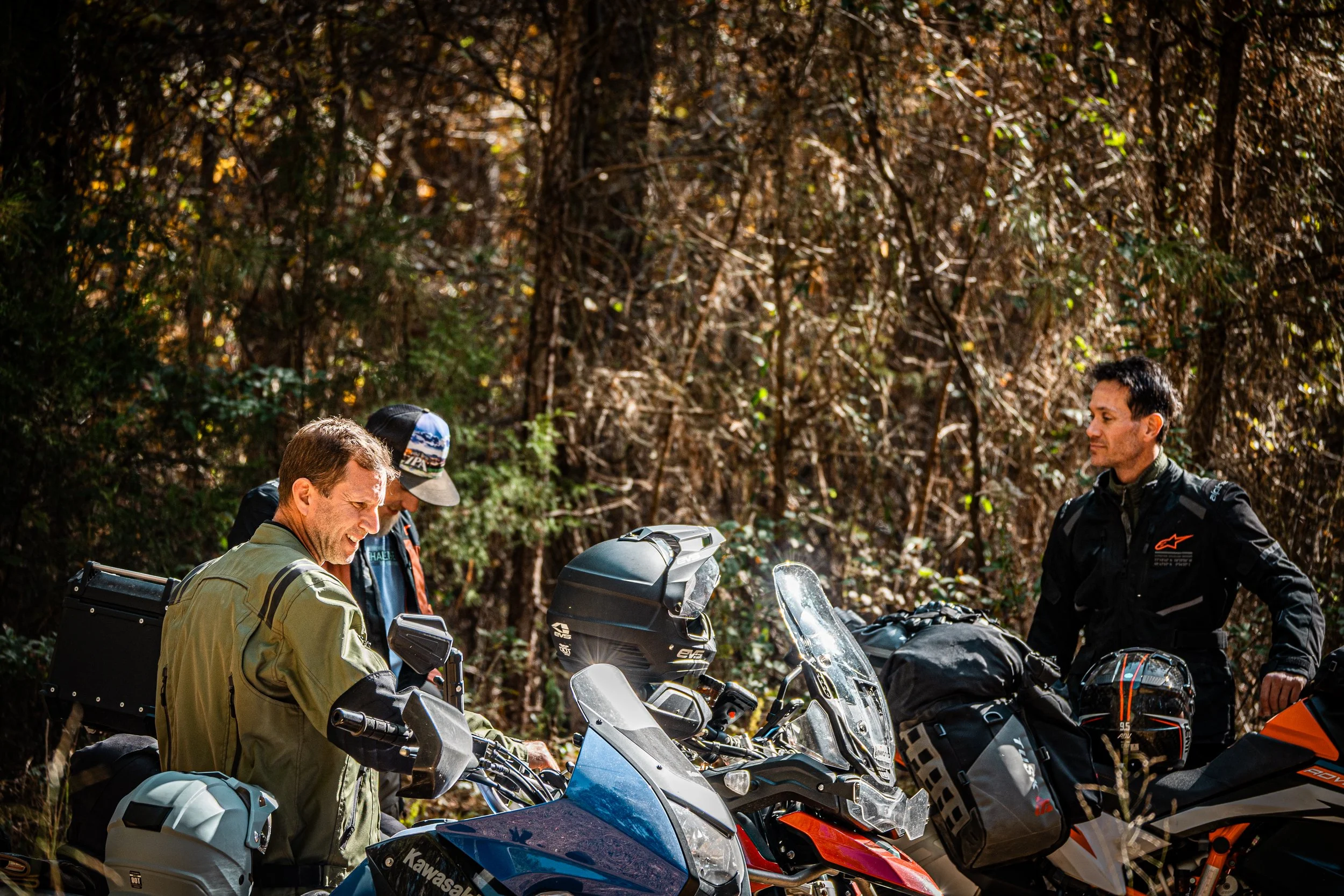 There’s a special kind of energy that hits you on departure day—the kind that buzzes through your gloves before the bikes even fire up. Day 1 of our SCAR adventure started at the Southeast Moto rental & training facility in Mill Spring, NC. Four of us—Matt, Heath, Larry, and myself—stood next to our packed ADV bikes, excited, awake, and ready. Larry was only joining us for the first day, but having him along felt like the perfect sendoff.